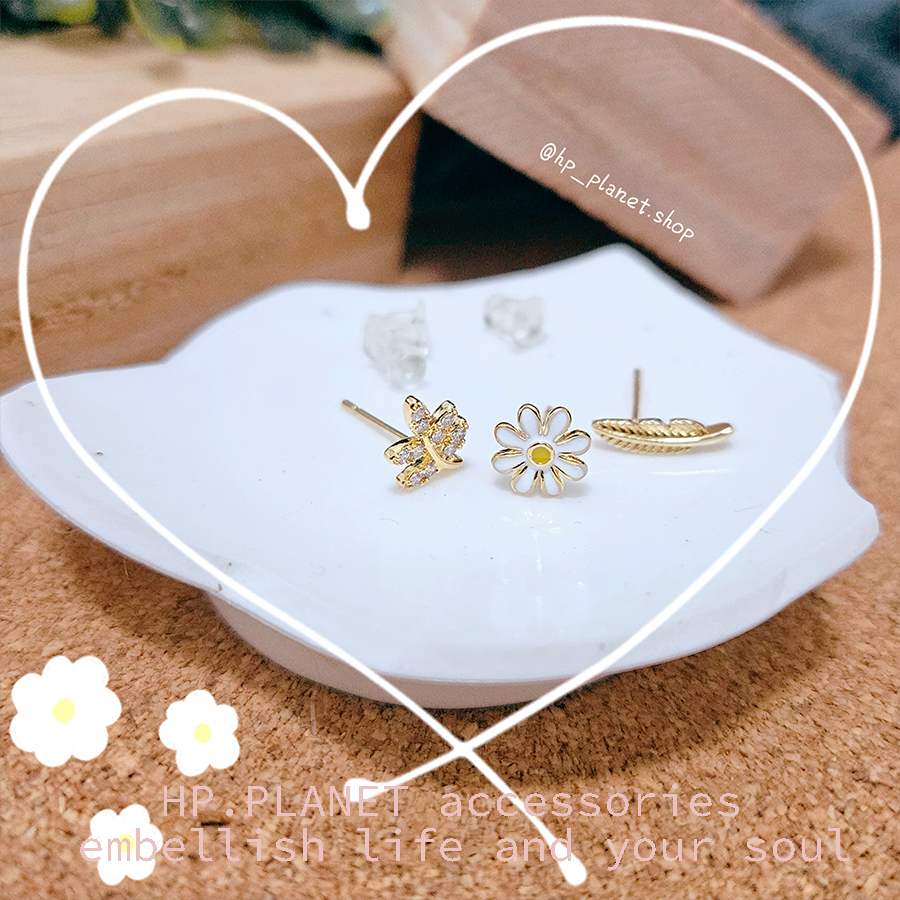 韓國 小巧雛菊•葉子•羽毛 925純銀耳針-三入組